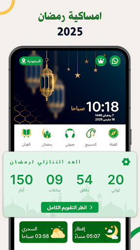 من أهم المميزات كمان هي منبه رمضان 2026 اللي بيذكرك بكل صلاة وكل وقت سحور أو إفطار. الميزة دي مفيدة جداً لو عندك جدول مزدحم أو مشغول بالشغل، التطبيق هيقوم بدور المساعد الشخصي ويضمنلك إنك متفوتش أي وقت مهم. ⏳🕌